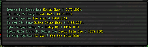 - Báo danh tại NPC Đặc Sứ Võ Lâm ( Dương Châu 212/198 ) trước 20h